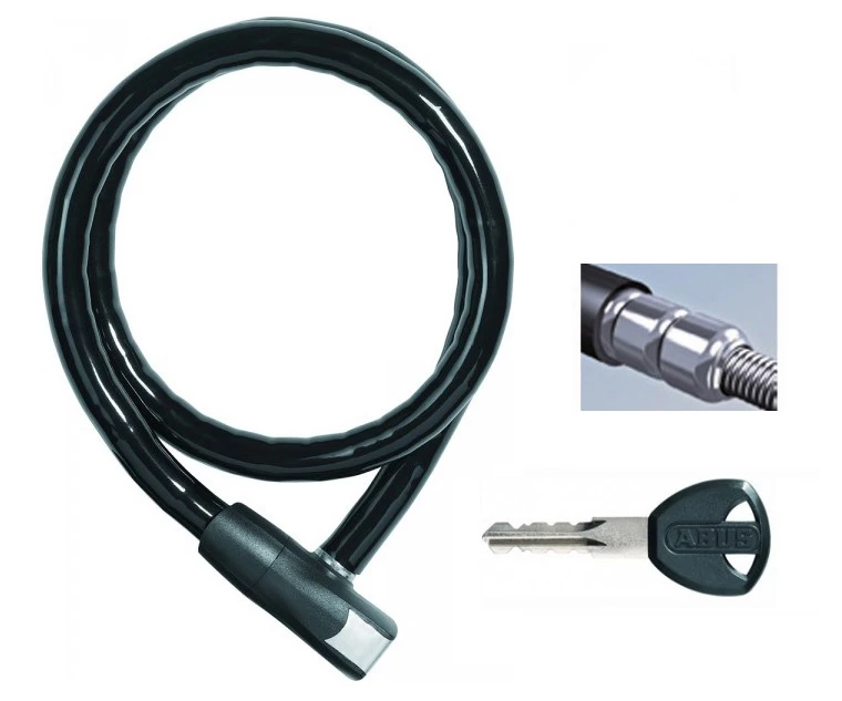 Der Name Steel-O-Flex steht bei ABUS für Kabelschlösser mit hoher Flexibilität und doppelter Sicherheit. Das Stahlkabel wird durch überlappende Hülsen aus gehärtetem Stahl umgeben wie ein Schuppenpanzer. Dadurch wird der Widerstand gegen Aufbruchsversuche deutlich erhöht, während das Gewicht nur moderat ansteigt und die Flexibilität weitgehend erhalten bleibt. Letztere ermöglicht auch ein unkompliziertes Anschließen des Fahrzeugs an einen festen Gegenstand.