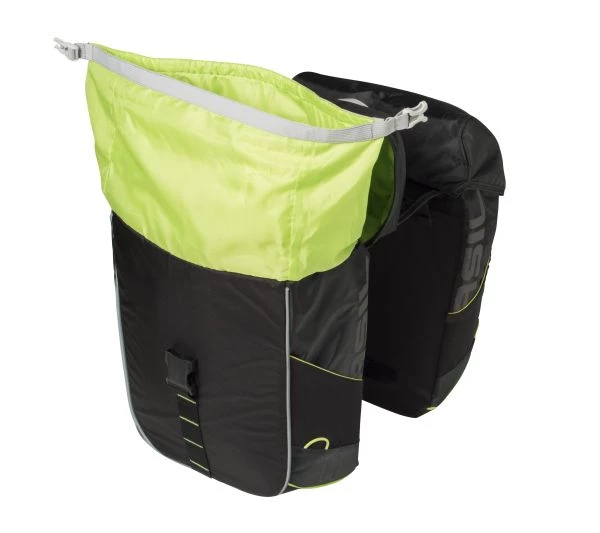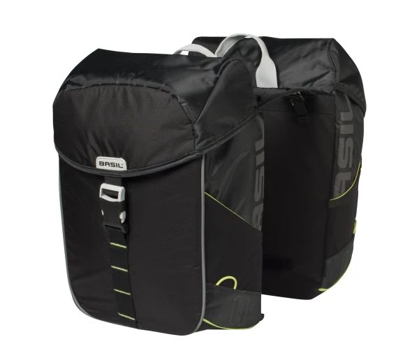 - Der Basil Miles Double Bag ist eine doppelte Fahrradtasche mit einem Gesamtinhalt von 34 Litern.