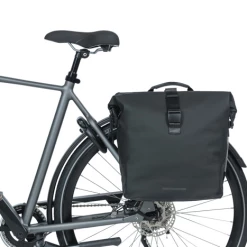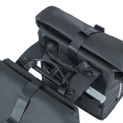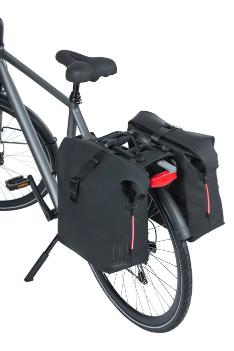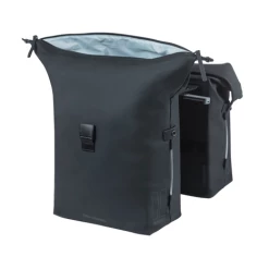 Du suchst eine geräumige Fahrradtasche, die außerdem auch schön aussieht? Dann ist die Basil SoHo Doppelfahrradtasche Nordlicht MIK in der Farbe Schwarz genau das Richtige für dich. Sie ist aus mattem PU-Material, das sich sehr weich anfühlt*, und hat ein Fassungsvermögen von 41 Litern. Die Tasche ist wasserdicht (IPX3), so dass deine Sachen immer trocken bleiben. Du schließt die Tasche mit einem Rolltop-Verschluss, den du mit Druckknöpfen an den Seiten der Tasche befestigst.