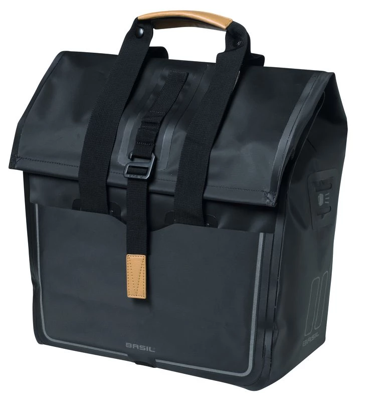 Der Basil Urban Dry Shopper ist ein praktischer Fahrradshopper mit einem Gesamtvolumen von 25 Litern. Sind Sie auf der Suche nach einem vielseitigen Shopper, der über eine moderne Ausstrahlung verfügt? Dann ist der Basil Urban Fahrradshopper bestimmt etwas für Sie. Dies hängt unter anderem mit den auffallenden veganen Lederdetails und dem Tarpaulin-Material, aus dem die Tasche gefertigt ist, zusammen. Darüber hinaus lässt sich dieser Shopper für mehrere Zwecke nutzen. Fährst du viel Fahrrad, zum Beispiel auf dem Weg zur Arbeit oder zum Supermarkt? Dann stellt dieser Shopper für dich einen Gewinn dar. Die Tasche eignet sich für das Erledigen von Einkäufen, genauso wie für das Transportieren eines Lunchpakets oder Regenkleidung. Die Tasche verfügt nicht nur über ein großes Innenfach mit Reißverschluss, sondern ebenfalls noch über ein praktisches Vorderfach. Dank der Handgriffe lässt sich die Tasche einfach überall hin mitnehmen, zum Beispiel in den Supermarkt. Die Fahrradtasche lässt sich mit Hilfe eines Faltverschlusses schließen. Reflektierende Details, die auf drei Seiten angebracht sind, sorgen dafür, dass Sie in Dunkelheit gut für andere Verkehrsteilnehmer sichtbar sind. Zuletzt verfügt der Shopper noch über einen verstellbaren Verschluss. Und dank des Hook-On Systems lässt sich die Tasche leicht am Gepäckträger Ihres Fahrrads befestigen, wodurch sie ebenfalls äußerst geeignet ist für ein elektrisches Fahrrad.