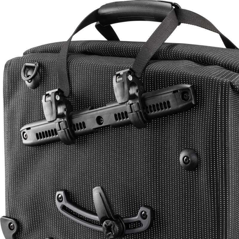 ?High Visibility heißt bei ORTLIEB: Radfahren mit einem Höchstmaß an Sicherheit. Das wasserdichte PU-beschichtete Cordura-Gewebe in schwarz ist komplett mit einem leuchtstarken Reflexgarn durchzogen. Im Scheinwerferlicht wird die gesamte Tasche zu einem unübersehbaren Reflektor.