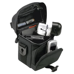 Klein, edel und mit Top-Ausstattung und gepolsterten Wänden. Hauptfach mit kombiniertem RV und Steckschloss, Vortasche und Deckel mit Innenfächern, ideal für kompakte Kameras. Komfortabler Tragegurt mit Schulterpolster. Die schmale Taschenform passt auch an stark geschwungene Lenker.