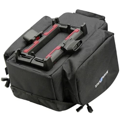 Formstabile Tasche mit gepolsterten Seitenwänden und ausklappbaren Seitentaschen, einseitig mit Netzfach. Das Haupfach mit Doppel-RV wird von einer zusätzlichen Stoffklappe abgedeckt, unter der auch Jacke oder Pulli verstaut werden können. Das Flaschenfach an der Rückseite lässt sich mit Zurgurt flach anlegen. Mit Reflektor, Lampenhalter, Tragegriff und Regenhaube. (Hinweis: Ausgeklappte Seitentaschen werden von der Regenhaube nicht komplett abgedeckt und sind nur an Gepäckträgern mit seitlicher Abstützung verwendbar.)